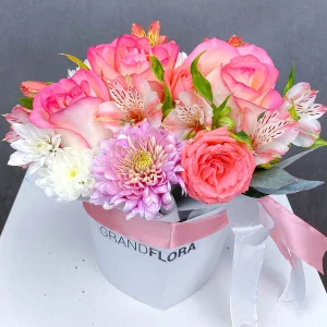 Нежность дня - шляпная коробка с розовыми кустовыми розами