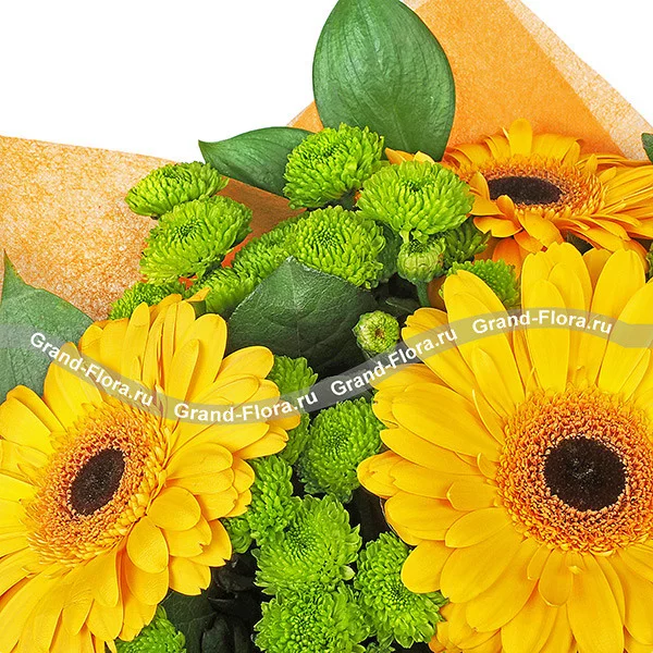 Попасть в объятия к солнцу и окружить любимую теплотой теперь еще проще! Достаточно заказать на сайте этот потрясающий по красоте букет, от которого веет положительными эмоциями. Роскошные желтые садовые герберы и миниатюрные головки зеленых хризантем составляют достойный дуэт красок. Букет понравится жизнерадостным девушкам и женщинам, он привнесет в их жизнь частичку праздника, жаркого лета и мирного солнца.