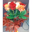 5 роз: роза красная - 2 шт.(70см), роза оранжевая - 2 шт.(70см), роза кремовая - 1 шт.(70см), Декор - осенние листья/ или упаковка.